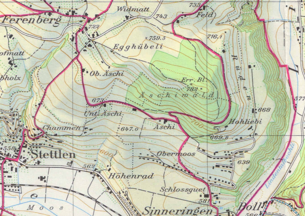 Als die Vereinigten Bern–Worb-Bahnen noch längst nicht im RBS aufgegangen waren, konnte man sich auf ihre Wanderkarte von 1952 verlassen und für den Spaziergang von Boll-Sinneringen nach Ferenberg auswählen: südlich oder nordöstlich um den Äschiwald oder eben mitten hindurch (Abbildung 1).