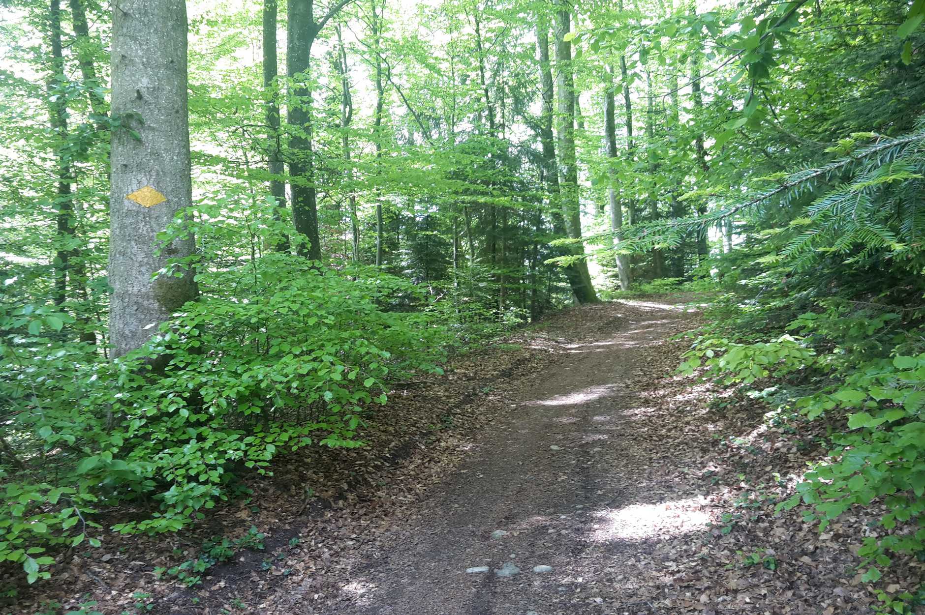 Daran hat sich bis heute nichts geändert. Aber wer zum Beispiel die Wanderkarte von Kümmerly und Frey von 1974 erstand, sah nur die beiden Wege um den Wald herum. Wollte man mittendurch, war ein unwegsames Stück Wald zu befürchten (Abbildung 2). Die etwa 300 Meter lange Strecke erwies sich aber auch damals sogar als kinderwagentauglich, fast durchgehend ein Karrweg, meist ins Gelände eingeschnitten.